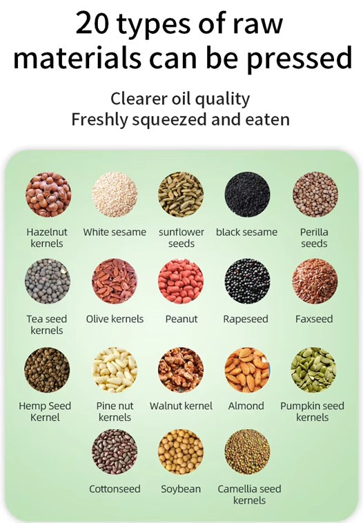 - Efficient Oil Extraction: Extract oil from a variety of seeds and nuts, including peanuts, sesame, sunflower seeds, flaxseeds, and more.
